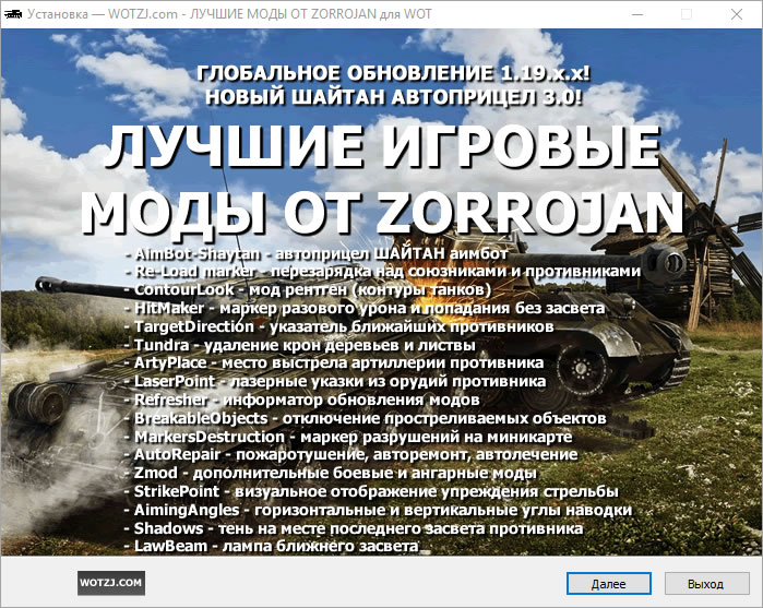 Marker Re-Load, AimBot-Shaytan 2.0, ContourLook, TargetDirection, HitMarker, Mod Tundra, ArtiPlace, LaserPoint, BreakableObjects, MarkersDestruction, Autorepair, Zmod, StrikePoint, AimingAngles, Shadows